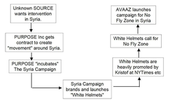 On 17 September 2014, Cory Morningstar wrote on The Wrong Kind of Green blog that "The New York public relations firm Purpose has created at lease four anti-Assad NGOs/campaigns" including the White Helmets and the March Campaign #withSyria, going on to say *"the message is clear.
