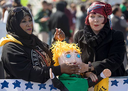 Judy Myers and Rabia Keeble cover the mouth of a Trump pinata during a protest at the California Republican Party Convention.