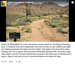 Sixty to one hundred searchers are working on and off the trail in the park in one of the largest searches in Joshua Tree in several years.