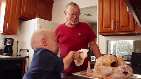 Gif of Reuben Troyer with his son, Verne Troyer from a cooking segment they did together.