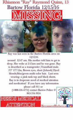 Raymond was last seen in Bartow, Florida at 12:45 am after his mother told him that he should go to bed. His mother only noticed that he left when she awoke to find him gone at 2:15 am. Rhiannon is described as being 5'5'', weighing 177 lbs, having a blonde/blue/green dyed fohawk, and having brown eyes. His attire at the time of his disappearance was a pink tank top and black shorts. [undefined]