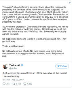 On August 22, 2017, it was revealed that an ESPN executive told New York magazine's Yashar Ali that the move was not about offending anyone, rather it was about shielding Lee from any memes or jokes made about him. The executive's response in full was: