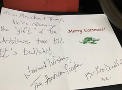 "Mrs. (sic) Mnuchin & Trump, We're returning the 'gift' of the Christmas tax bill.