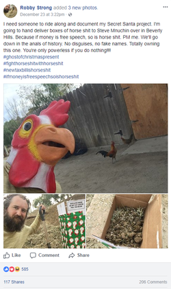 At 12:22 p.m. PST on December 23, 2017, Strong posted three pictures to Facebook, one of which depicts himself posing with a shovel next to a gift wrapped box, and another of which shows the box full of what appears to be fecal matter. They were accompanied by a message that reads in part as follows: "I need someone to ride along and document my Secret Santa project. I'm going to hand deliver boxes of horse s**t to Steve Mnuchin over in Beverly Hills."
