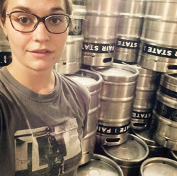 Rose with barrels of beer at the Fair State Brewing Cooperative where she does Quality assurance [15]