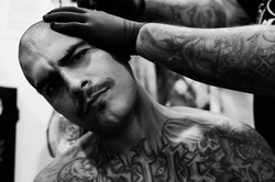 He has "I'm still here" on the left side of his head; the phrase is the single that helped him get noticed in which he tells a story about getting stabbed four times.