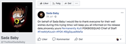 On July 28, 2017, Sada Baby's management released the following statement on his Facebook fan page: On behalf of Sada Baby I would like to thank everyone for their well wishes during this trying time.I will keep you all informed on his release date,sincerely yours Permanently Kutt PGKBIGSQUAD Chief of Staff #FreeMyKousin #PGK # BigSquadMafia. [14]