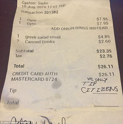 "I’d happily do the jail time if I could get just one solid punch in to the face of the son of a bitch who paid for his meal at the luncheonette where my granddaughter works and left the receipt for her with a note saying, “Sorry, we only tip citizens".