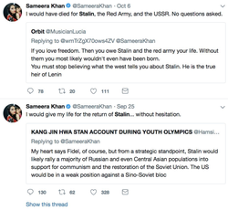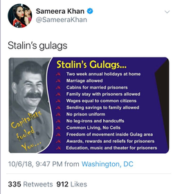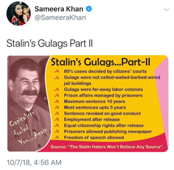 In 2018, Sameera Khan posted a variety of tweets defending Joseph Stalin. [16] She posted multiple memes about Stalin’s gulags. [14] [15] On October 8, 2018, she apologized for the gulag memes, stating she found out that the information in the memes she shared was "inaccurate." In the tweet, she said: