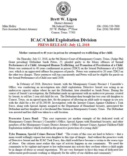 “This case represents yet another example of the dedicated work of Montgomery County Precinct 1 Constable’s Office, Special Agents with Homeland Security and other members of the Montgomery County District Attorney’s Office Internet Crimes Against Children/Child Exploitation taskforce which resulted in the proactive protection of a young child,”Prosecutor Laura Bond said. [1]