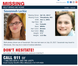 On July 20, 2017 Savannah went missing and may be headed to Minnesota where she has friends and family or to Hollister, Missouri where her biological father lives. Leckie's mother Rebecca Ruud said her daughter was home when she went to sleep around 11 p.m. Wednesday, July 19, but when she awoke at 8 a.m. Thursday, July 20, the girl was gone. Ruud and a neighbor searched the family's farm and property off County Road 905 but could not find the girl. Ruud contacted authorities around 10 a.m., and dozens of people responded to the scene. [0]