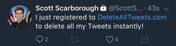 In a Tweet posted by @Comfort, showing the order of events of Scarborough being caught, blocking, deleting tweets, and then ultimately deleting his profile.