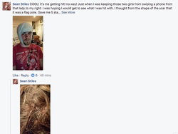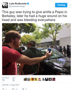 He was documented trying to give a Pepsi can do Antifa members in which they refused. [1]Later he was assaulted by Eric Clanton with a bike lock. He later required stitches. [4]