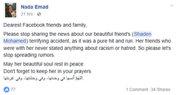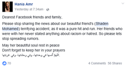 A week later, a witness came forward saying that her death was the result of a hate crime. Two men allegedly came out of the vehicle and told Shaden while she was injured that she should "fuck off back to her own country" and a "fucking asylum seeker." [10]