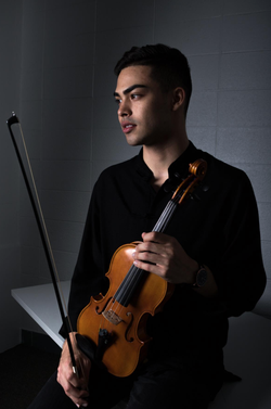 Shannon holds his violin.