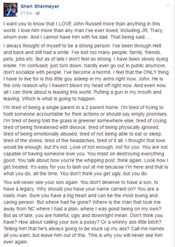 On December 26, 2016 Sheri wrote a murder-suicide note on Facebook. In it, she details the abuse she's been coping with under her husband, Tracy Alan Shermeyer, themes of feeling trapped, regret, loneliness, and despair are prevalent throughout the note. These extreme emotions drove Sheri to respond to her husband is to rob him of his legacy, and killing their son.