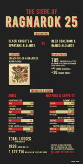The Siege of Ragnarok 25 was the last major virtual battle to take place on the old official (legacy) servers in the action adventure survival game Ark: Survival Evolved and was possibly the longest battle to ever take place in a video game. [1]