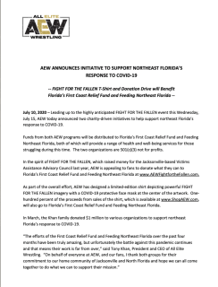 Sonny Kiss challenged Cody Rhodes for a shot at the TNT Championship Title belt on July 15, 2020 at the second annual Fight For The Fallen event. Normally a PPV event, Fight For The Fallen 2020 aired on TNT and also functioned as a Covid-19 Relief Benefit, with donations and 100% specified merchandise sales given to pandemic relief efforts in Florida, where AEW has been taping their shows outdoors at Daily's Place. Sonny lost to Rhodes, but was able to use Cody's own move (Cross Rhodes) on him, surprising many.[49][50]