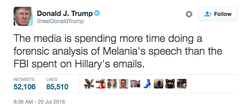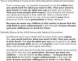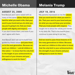 On the first night of the 2016 Republican National Convention, Melania Trump, in a highly anticipated speech plagiarized from Michelle Obama's 2008 Democratic National Convention speech. [1]