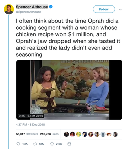 Days after Althouse's tweet was made, Oprah made her own response on the O, The Oprah Magazine Instagram. She said the following: " The truth, for me, is that I was used to having salt and pepper on my chicken... that's what I was thinking, 'This chicken needs some salt and pepper." [-1]
