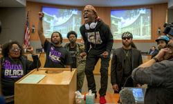 Stevante Clark rallying up protestors at the City Council hearing regarding the death of his brother, Stephon Clark.