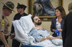 Bourgoin was wheeled into his arraignment in his hospital gown and a stretcher.