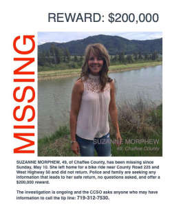 Suzanne Morphew went for a bike ride on May 10 west of Maysville in the area of Chaffee County Road 225 and West Highway 50. Her neighbors called the county sheriff's office when she didn't come home. Morphew's bike was reportedly recovered the night she vanished.