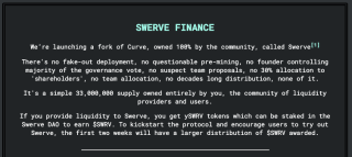 Swerve is a clone of Curve Finance only without a pre-mine, token allocation to shareholders, and extended distribution of tokens. Swerve has a single pool that accommodates leading stablecoins such as DAI, TUSD, USDT, and USDC. The creation of new pools is a function of the protocolâs DAO. [1]