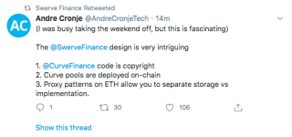 After launch, yEarn founder Andre Cronje tweeted his support of $SWRV. He mentioned Swerve Financeâs design was âvery intriguingâ and stated: