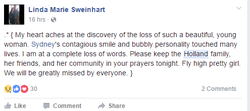 On February 26, 2017 Sydney died in a car accident. The Florida Highway Patrol said that Syndey Holland of Marianna was driving south on County Road 269 around 8:10 p.m. on Sunday when they said her car traveled off the road and onto the shoulder. They said that she failed to follow a left curve in the road. Holland's car hit a culvert before it collided into a tree, finally stopping the vehicle. Police say Holland was transported to Tallahassee Memorial Hospital where she later died from her injuries. Toxicology reports are pending.