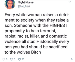On November 26, 2017, Baker came under public scrutiny after posting the tweet " Every white woman raises a detriment to society when they raise a son. Someone with the HIGHEST propensity to be a terrorist, rapist, racist, killer, and domestic violence all star. Historically every son you had should be sacrificed to the wolves", on her Twitter profile. [0]