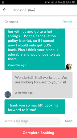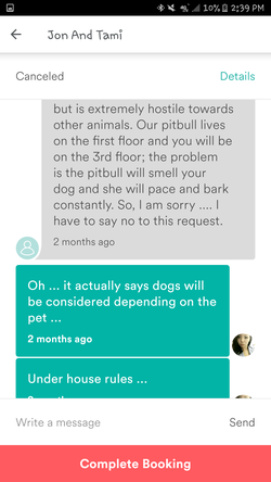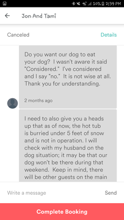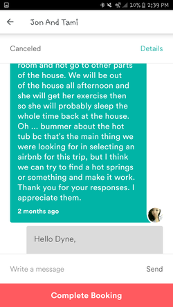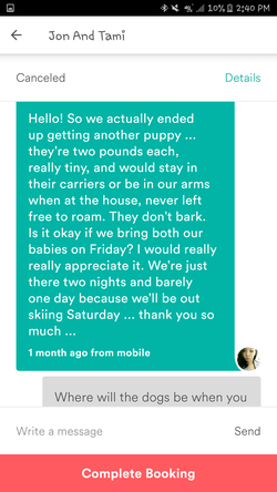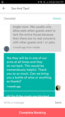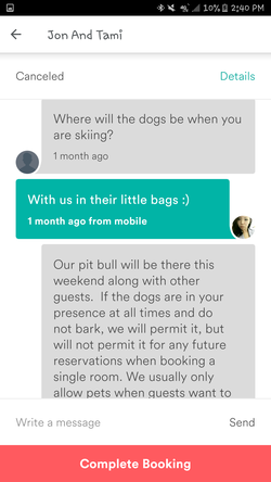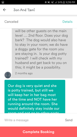 Dyne Suh also provided screen shots of her conversation with the host about bringing her puppy to the cabin.