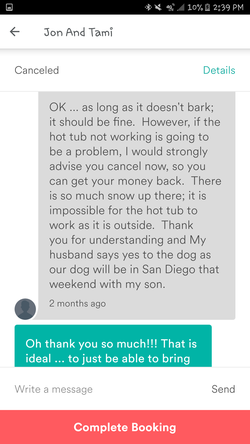 Dyne Suh: Hi Tami! Just wanted to let u know we have a teacup yorkie who is extremely well-behaved, quiet, and sweet and is about 1lb right now. Wanted to ask if it was okay with you for us to bring her. She would mostly stay in her little bag. Thank you! Tami Barker: Hello Dyne. Our listing is very clear that we do not acept dogs. We would love to be able to do that; however, our pitbull would love nothing more than to eat your sweet dog. Our pitbull loves people and super friendly but is extremely hostile towards other animals. Our pitbull lives on the first floor and you wil be on the 3rd floor; the problem is the pitbull will smell your dog and she will pace and bark constantly. So, I am sorry.... I have to say no to this request. Dyne Suh: Oh... it actually says dogs will be considered depending on the pet... Under house rules... Tami Barker: Do you want our dog to eat your dog? I wasn't aware it said "Considered." I've considered and I say "no." It is not wise at all. Thank you for understanding. I need to also give you a heads up that as of now, the hot tub is burried under5 feet of snow and is not in operation. I will check with my husband on the dog situation; it may be that our dog won't be there during that weekend. Keep in mind, there will be other guests on the main level.... 2nd floor. Does your dog bark? The dog would also have to stay in your room; we do have a doggy gate for the room you are staying in. Is your dog potty trained? I will check with my husband and get back to you on this; it might be a possibility. Dyne Suh: Our dog is very quiet and she is potty trained, but still we will keep her in her bag most of the time and NOT have her running around the room. She would definitely stay inside our room and not go to other parts of the house. We will be out of the house all afternoon and she will get her exercise then so she will probably sleep the whole timeback at the house. Oh... bummer about the hot tub bc that's the main thing we were looking for in selecting an airbnb for this trip, but I think we can try to find a hot springs or something and make it work. Thank you for your responses. I appreciate them. Tami Barker: Hello Dyne, OK... as long as it doesn't bark; it should be fine. However, if the hot tub not working is going to be a problem, I would strongly adivse you cancel now, so you can get your money back. There is so much snow up there; it is impossible for the hot tub to work as it is outside. Thank you for understanding and My husband says yes to the dog as our dog will be in San Diego that weekend with my son. Dyne Suh: Oh thank you so much!!! That is ideal... to just be able to bring her with us and go to a hot springs... bc the cancellation policy is strict, so if I cancel now I would only get 50% back. Plus I think your place is adorable and would love to stay there Tami Barker: Wonderful! It all works out. We are looking forward to your visit. Dyne Suh: Thank you so much!!! Looking forward to it too!