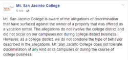 "Mt. San Jacinto College is aware of the allegations of discrimination that have surfaced against the owner of a property that was offered as a vacation rental.