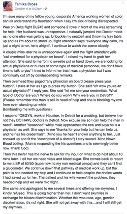 The Flight attendant responded when seeing Tamika, โOh wow, youโre an actual physician?โ A white male then approached the row where the man was dying and said he was a physician as well, the flight attendant then said, "thanks for your help but he can help us, and he has his credentials.โ