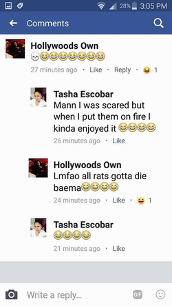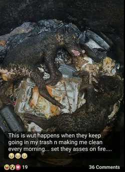 On Facebook, she said that burning them made her "kinda happy", and that she was waiting for their "mama" to come so she could burn her as well. She has since deleted her social media accounts.