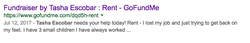 In July 2017, Tasha had a GoFundMe asking for money to help pay for rent. She had just lost her job and was having difficulty providing for her family.