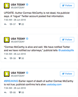 Tommasso Debenedetti's 2016 hoax was announcing the death of Cormac McCarthy from a fake Twitter account purporting to be McCarthy's publisher Alfred A. Knopf.