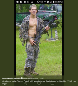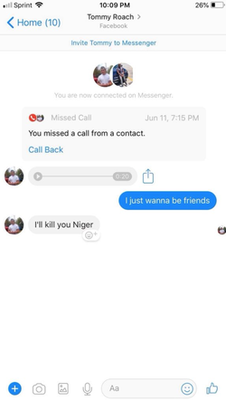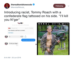 On June 26th, 2018, a screenshot showing Roach's racism and violent threats to a black person was shared on Twitter. Screenshots of the racial slur and of Roach's identity were shared by Kenidra Woods with the post saying: "Introducing racist, Tommy Roach with a confederate flag tattooed on his side. 'I'll kill you N*ger'".