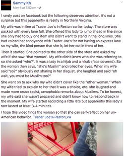 The encounter allegedly took place at a Trader Joe's in northern Virgínia over the weekend, according to a South Carolina-based comedian who posted the video, claiming the Muslim woman involved in the incident is his friend. The comedian was Jeremy McLellan. He posted the video just before midnight on Saturday May 6th, 2017. In his post on Facebook, he writes that the video takes place at the Trader Joe’s in Reston, Virginia. [0]