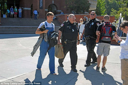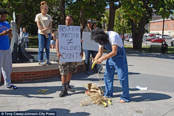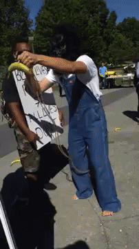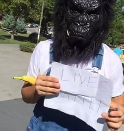 At a Black Lives Matter rally. Tristan Rettke handed out bananas wrapped in nooses in a gorilla mask and blue overalls to protestors. He was arrested and charged with civil rights intimidation. [undefined] Tristan's attempted to provoke the protestors failed miserably.