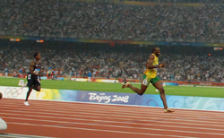 While he had not won any significant 100 m title prior to the 2008 Olympics, he had won numerous crowns in the 200 m event at the youth, junior and senior levels. Further, at the 2013 World Championships in Moscow, Bolt completed a hat-trick of 200 m world titles by winning his third straight gold in the event. His 2009 record breaking margin for 100 m, from 9.69 seconds (his own previous world record) to 9.58, is the highest since the start of fully automatic time measurements.
