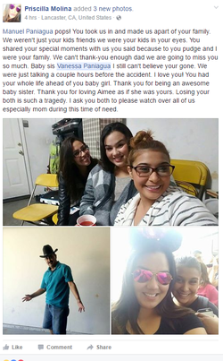On February 12, 2017 Vanessa and her father, Manuel Paniagua were killed in a high-speed crash after their vehicle split in two on impact in Palmdale [3]. They were both pronounced dead at the scene. Palmdale sheriff's officials responded to the scene of the single-vehicle collision on 25th Street East and Joshua Hills Drive shortly before 6:30 p.m. according to the Los Angeles County Sheriff's Department. The yellow 2014 Chevrolet Camaro they were in was seen split in two at the intersection. Sheriff's officials said the bright yellow car was traveling at a high rate of speed on southbound 25th Street East when it lost control and hit a traffic signal. The impact sheared the Camaro in half and left the car in pieces. [1]