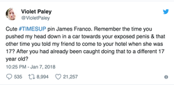 On January 7th, 2017, Paley took to her twitter to oust Franco over the hypocrisy of him wearing the #timesup pin to represent the end of sexual abuse predominantly against women.