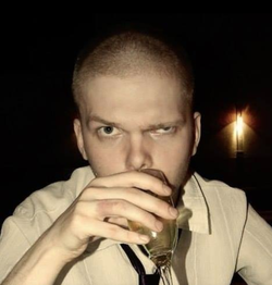 Photo of Vitaly Bespalov with buzzed hair drinking beer.