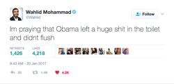 Citation Linkeveripedia-storage.s3.amazonaws.comWahlid's legendary tweet about president Barack Obamaleaving poop on the toilet for Donald Trumpto find.[11]