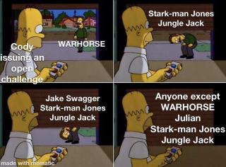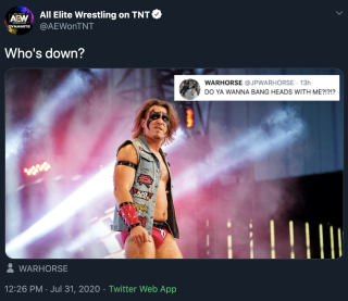 After the announcement of the TNT Championship belt open challenge in the summer of 2020, wrestling fans on Twitter demanded that Cody Rhodes invite WARHORSE for a title shot. Many fans created memes and the popular hashtag #CODYFEARSWARHORSE, taunting the AEW superstar. On July 13, 2020 a tweet was posted by the official AEW account that features a clip from an interview with Cody Rhodes and his manager Arn Anderson. When asked who his fighter was looking most forward to wrestling in the independent scene or AEW roster in a title match, Arn stated,[61][62]