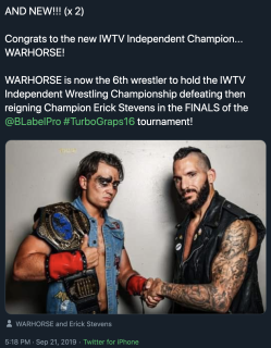 On September 21, 2019 WARHORSE was crowned the IWTV (Independent Wrestling.tv) Champion after defeating Erick Stevens. WARHORSE is the active title holder as of February 2020.[17]