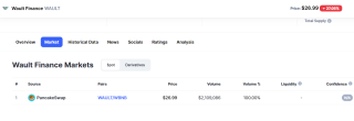 Wault Finance (WAULT) is a native BEP-20 cryptocurrency token issued on the Binance Smart Chain as the utility token within Wault Finance. The token's ticker is symbolized as $WAULT and it should be noted that it has a Maximum supply of 1,000,000 WAULT. The token is utilized for staking and it has registered an All-Time High of $47.59 USD on February 25, 2021, and an All-Time-Low of $5.76 USD on February 23, 2021.[13]