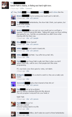 During her time as a reality tv personality on her mother's show, she responded on Facebook with Homophobic slurs to people who were bashing her mother's show. [12]On her sister's show, *Bristol Palin: Life's a Tripp *, she was also considered to be the most indignant of the Palins with constant disapproval of Bristol's boyfriend and overall embarrassment for the people around her. [8]